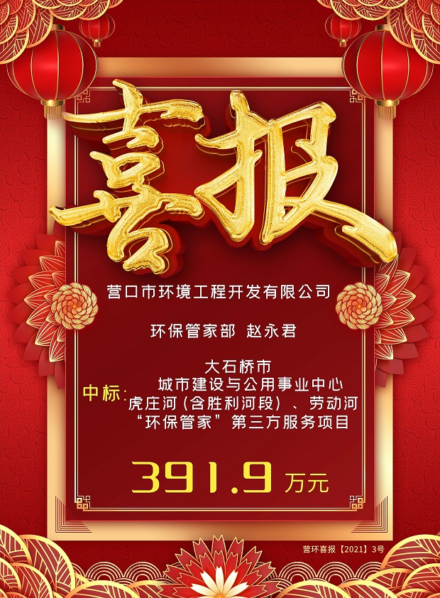 營口市環境工程開發有限公司中標大石橋市城市建設與公用事業中心虎莊河(含勝利河段)、勞動河“環保管家”第三方服務項目